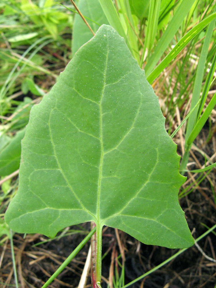 More or less arrowhead-shaped, but with the basal lobes divergent.