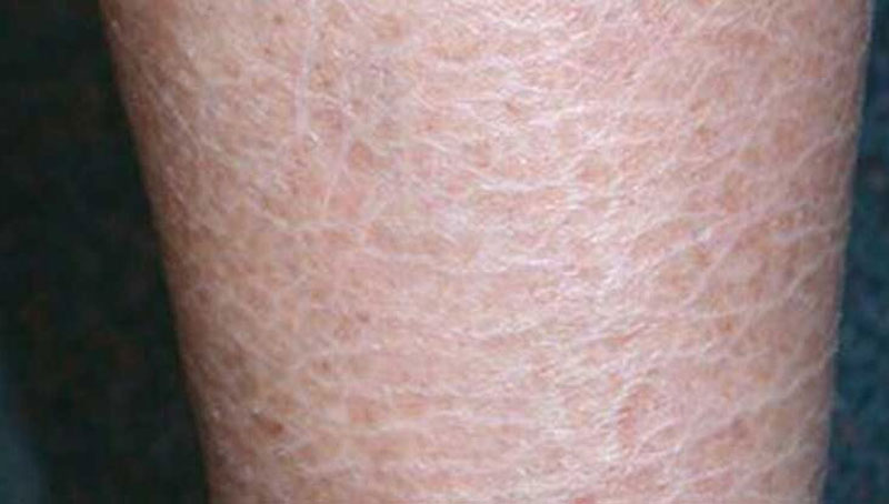 A condition characterized by dry, rectangular scales on the skin that is most pronounced on the legs. Ichthyosis vulgaris is the result of a hereditary skin defect that causes excessive accumulation of scales on the skin. Symptoms vary in severity. Mild cases cause primarily cosmetic problems. More serious ichthyosis leads to painful, bleeding cracks in the skin that can become infected if left untreated.