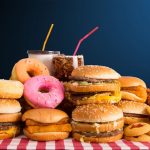 Food of little nutritional value, e.g. high-fat processed snacks, eaten between or instead of meals.