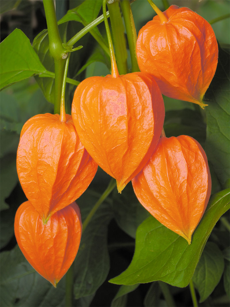 Edible berries are borne inside fascinating orange Chinese lantern-like calyces. Berries are eaten raw, or in preserves and pies. Recommended for fevers and gout.