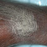 Thickening and hardening of skin, often resulting from scratching or irritation.