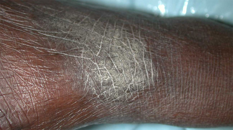 The thickening of certain cell layers in the epidermis causing brown or violet patches in the skin with exaggeration of the normal creases. A criss-cross appearance results, containing lozenge shaped flat-topped shiny areas. The cause is abnormal scratching or rubbing of the skin.