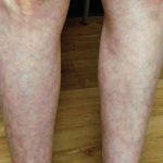 Discoloured spots on the skin.