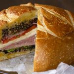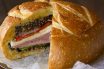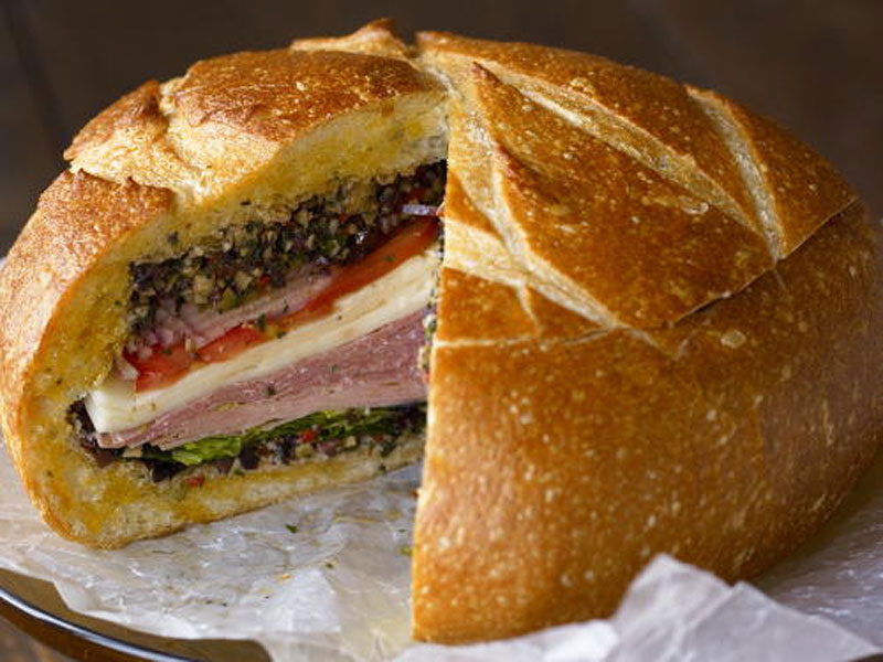A monumental sandwich creation which boasts an unusual combination of ingredients including olive salad layered between halves of chewy Italian bread loaves.