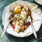 Since the mid eighteenth century papillote has referred to a colourful paper frill tied as a decoration to the bone end of a drumstick, lamb chop, or pork chop. The word derives from the French papillon, meaning butterfly, so called because the colourful frills resemble the wings of that insect. In turn, the French papillon derives from the Latin papilio, which is also the source of the word pavilion, originally the name of a large tent whose door flaps were shaped like butterfly wings. In the early nineteenth century, English also acquired the French term en papillate, used to describe foods wrapped in greased paper (or tin foil) before being placed in the oven; potatoes are often cooked en papillate, as are fish.