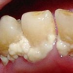 A mixture of bacteria, saliva, and leftover food that forms a deposit on teeth and eats into the enamel, causing tooth decay, or caries. If plaque is not cleaned off routinely, it hardens into a mineral deposit called calculus or tartar, which the dentist must remove by scaling.