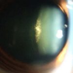 Clouding of the space behind and below the capsule that contains the lens of the eye.