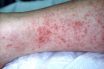 An uncommon infectious illness characterized by a fever and a spotty rash that expands across the body, becomes darker, grows in size, and may bleed.