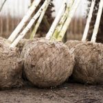 The root mass and surrounding soil of a container-grown plant or a plant dug out of the ground.