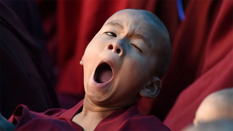 The act of opening the mouth wide without conscious control and slowly releasing a deep breath, usually a sign of tiredness or boredom.