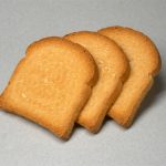 The given passage describes a type of food item that is hard, dry, sweet, and toasted. This item is commonly referred to as biscotti, which literally translates to “twice baked.” It is also known by the names of rusk or Brussels biscuit.