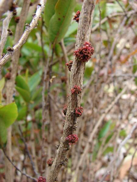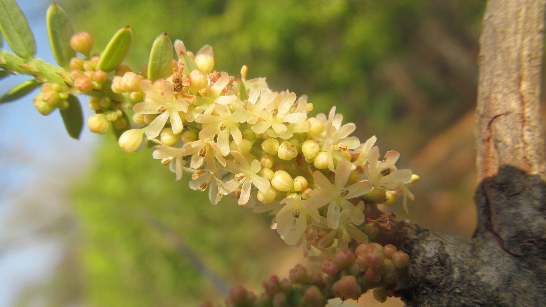 Flowers are greenish-yellow, fascicled in axils of leaves or fallen leaves, unisexual. The male flowers are numerous at base of young twigs, the female flowers solitary and higher up the twig. Male flowers are shortly pedicellate, with six pale green perianth lobes 1.5–2.5 mm long and three entirely connate stamens, six disk glands alternating with the perianth lobes; female flowers sessile, with six somewhat larger perianth lobes, a cup-like six-angular disk, and a superior three celled, glabrous ovary crowned by three styles, connate for more than half of their length and deeply bifid at apex. The flowers are self-fertile and pollinated by wind and insects, including bees. Each flower bud opens to yield from one to four flowers, depending on cultivar.