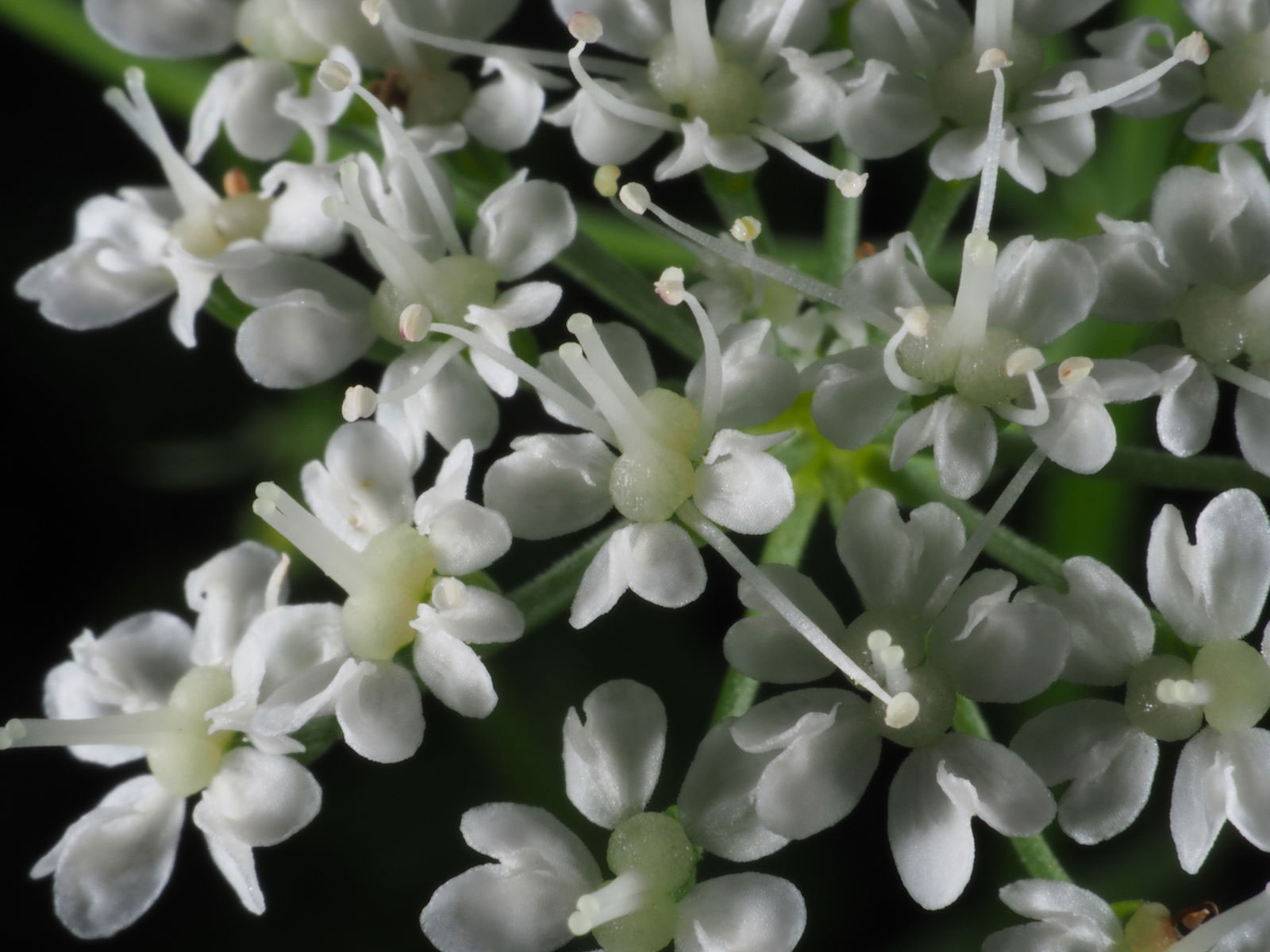 The stalks terminate in compound umbels of flowers about 1½-3½ inches across that are flat-topped. Each compound umbel is divided into 10-20 umbellets, while each umbellet is divided into 10-25 flowers. The compound umbels lack floral bracts and the umbellets lack floral bractlets. Individual flowers are about 1/8 inches (3 mm.) across, consisting of 5 white petals with incurved tips and an inferior ovary with a pair of styles. The peduncles of the compound umbels are 3-6 inches long, light green, glabrous, angular, and grooved. The pedicels of individual flowers are about ¼ inches in length, light green, and glabrous. The blooming period occurs from late spring to mid-summer, lasting about 1 month.