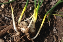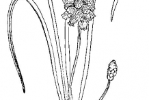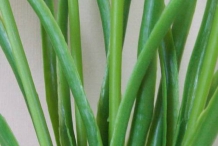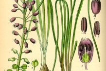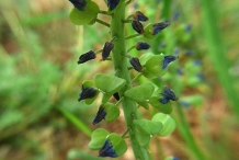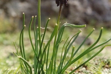 The plant is herbaceous which grows to 25 cm with 2-3 by 2-2.5 cm ovoid bulbs covered with dark brown tunic. Leaves are linear to lanceolate measuring 5 to 35 cm long and 0.25 to 0.75 cm wide. Scapes are 25 cm long. Flowers are blue to purplish on 1 to 5 mm nodding pedicles. Sterile flowers are smaller and paler in comparison to fertile ones. Perianth tube is ovoid to oblong-urceolate or cylindric measuring 3 to 7 mm. The plant bears capsule as a fruit which is broadly ovate to orbicular, 5-9 × 8-10 mm having tip rounded or shortly emarginated.