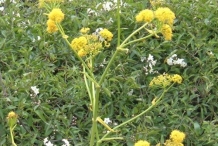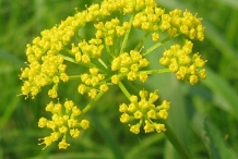 Ferula assafoetida is a monoecious, herbaceous, perennial plant of the family Apiaceae. It grows to 2 m (6.6 ft.) high, with a circular mass of 30–40 cm (12–16 in) leaves. Stem leaves have wide sheathing petioles. Flowering stems are 2.5–3 m (8.2–9.8 ft.) high and 10 cm (3.9 in) thick and hollow, with a number of schizogenous ducts in the cortex containing the resinous gum. Flowers are pale greenish yellow produced in large compound umbels. Roots are thick, massive, and pulpy. They yield a resin similar to that of the stems. All parts of the plant have the distinctive fetid smell.
