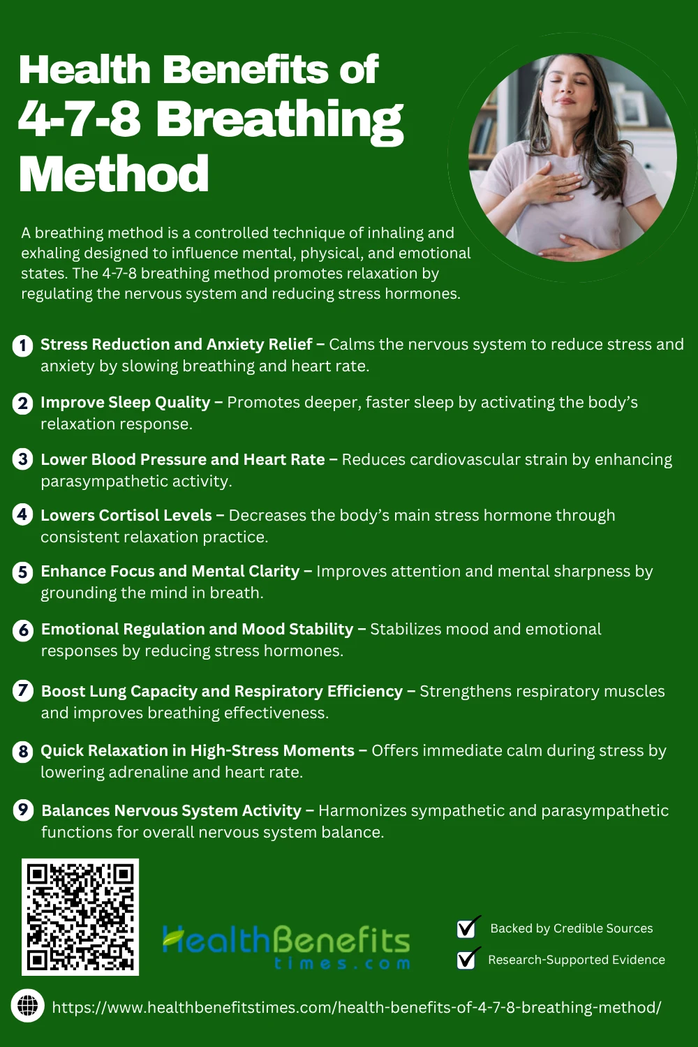 - The 4-7-8 breathing method promotes relaxation by regulating the nervous system and reducing stress hormones.