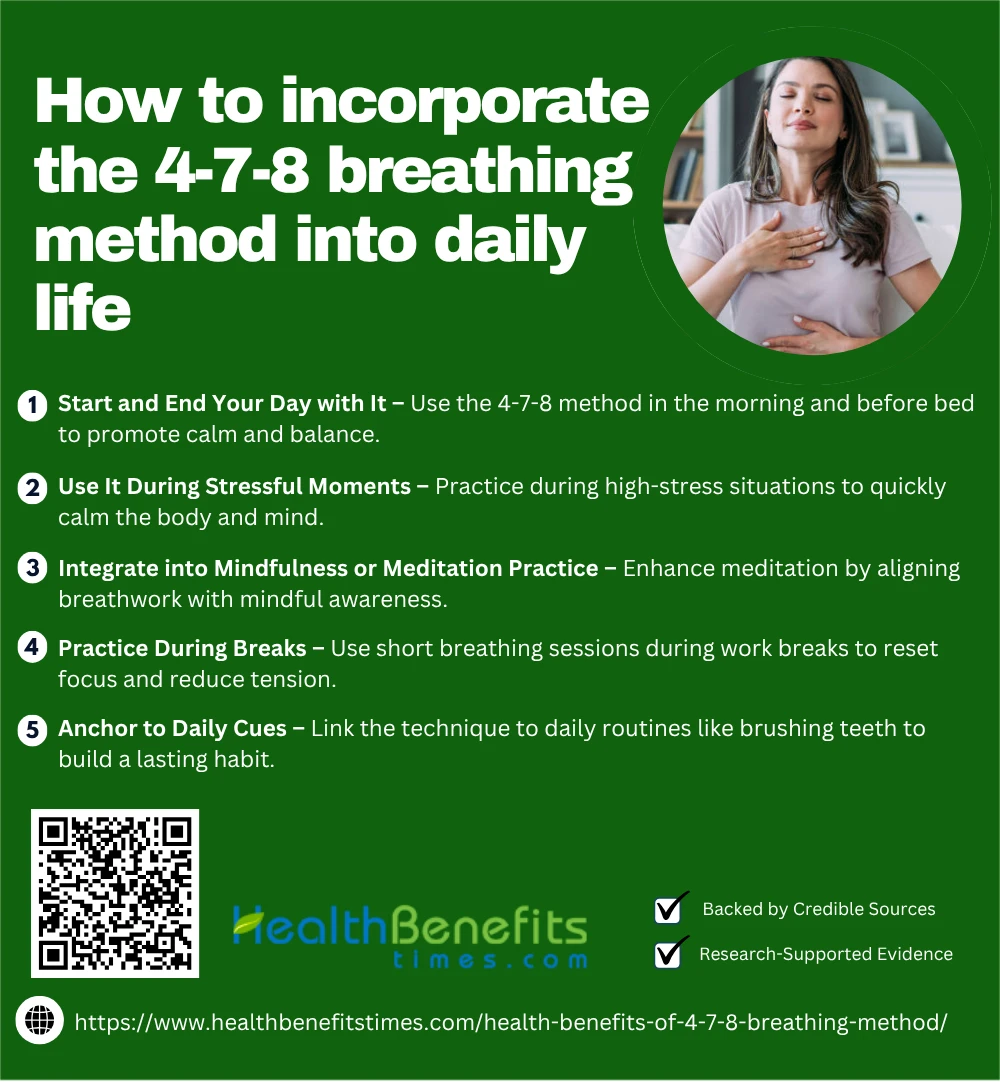 Incorporating the 4-7-8 breathing method into daily life is easy and effective. Use it during stressful moments, bedtime routines, or meditation to promote relaxation, focus, and emotional balance.