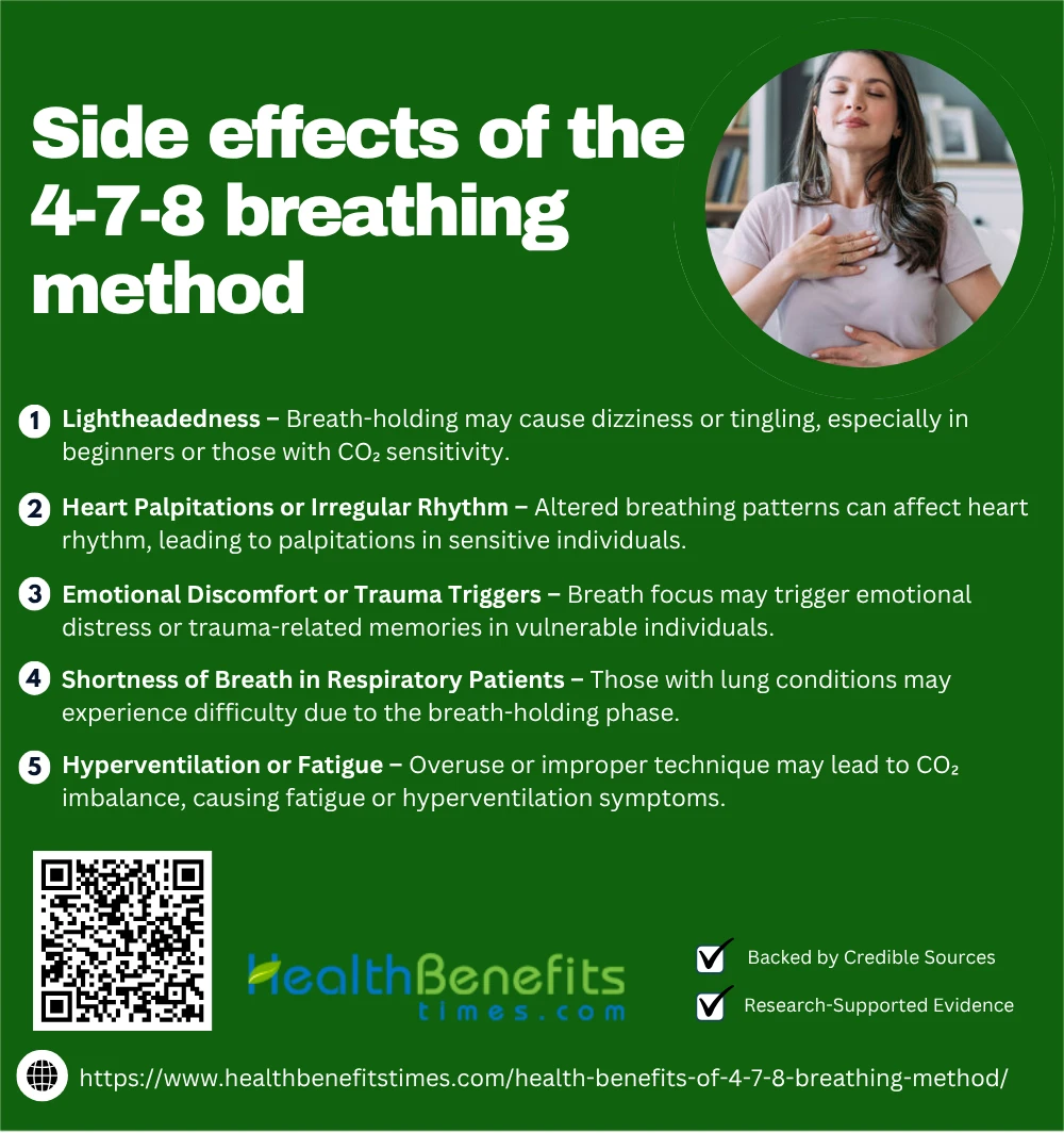 The 4-7-8 breathing method is typically safe, but beginners may experience lightheadedness, dizziness, or shortness of breath. These side effects often subside with practice and proper technique.