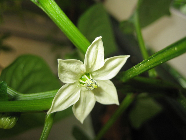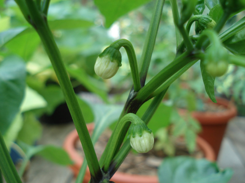 Bell pepper is a small, branched, mostly erect, annual or perennial herbaceous shrub, 30–80 cm tall. Plant requires warm environment to grow well and prefers well structured, well drained, friable, sandy loam. It is intolerant of high salt content in the soil and frost. Plant has short or deep tap root with glabrescent stems. Leaves are solitary or paired; alternate, petiole 4–7 cm; leaf blade oblong to ovate, ovate, or ovate-lanceolate, 4–13 × 1.5–4 cm, glabrescent, base narrowed, margin entire and wavy, apex short acuminate or acute. Flowers are small, off-white, pendent. Calyx is campanulate, 2–3 × 3 mm five-toothed, undulate, and green. Corolla rotate, five-lobed white, 10 mm. Stamens 5, inserted, anthers bluish/purplish, 1.8–2 mm. Ovary superior, 2–3 locular with numerous ovules, style short with capitate stigma.