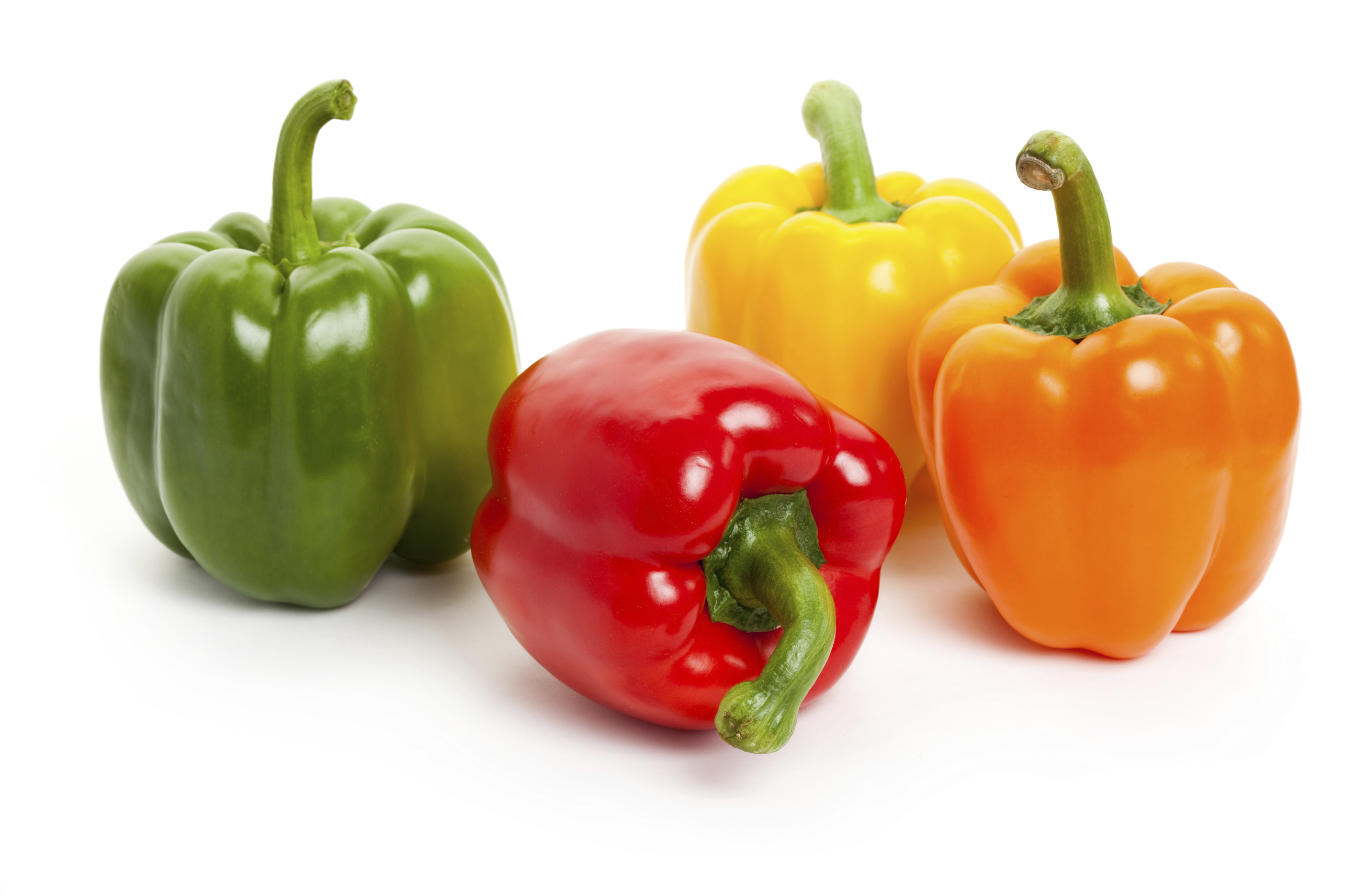 Bell peppers (Capsicum annuum) are the fruits of certain plants from the nightshade family. Normally they are berry, pericarp fleshy and firm, pendent, hollow, variously shaped; up to 15 cm. Peppers are usually green when young to mostly red orange, yellow, white, brown or purple when mature. Color changes in most commercial cultivars are green to red, green to yellow or green to orange. Usually, fruits of the purple and white varieties have these colors as they develop, and therefore do not have a green stage. Skin is normally smooth. It has bitter taste while young turning to milder and sweeter as they mature. Seeds are discoid or reniform, pale yellow, 3–5 mm across. Bell peppers are a great combination of tangy taste and crunchy texture. Green and purple peppers are slightly bitter in taste whereas yellow, red and orange have a fruity and sweeter taste. Bell peppers add flavor to the food no matter how they are prepared, whether they are baked, roasted, cooked or stuffed.