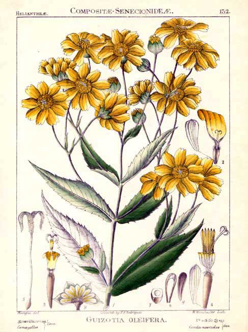 Niger scientifically known as Guizotia abyssinica is an oilseed crop that belongs to the Asteraceae family and on Guizotia genus. It is originated in Ethiopia, and its wild ancestor is likely Guizotia schimperi Sch.Bip. It was probably domesticated before 3000 BC in the highlands of Ethiopia, where it is still cultivated as an oilseed crop. The earliest name given to this plant was Verbesina oleifera. The first botanical description of Niger was Polymnia abyssinica L. Apart from Niger it is also known Ramtil, Inga seed, Niger, Niger-seed, blackseed, noog/nug, nyger, nyjer, Niger-seed oil and ramtil oil.