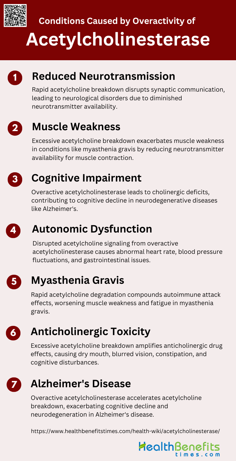 Overactivity of acetylcholinesterase can lead to a rapid breakdown of acetylcholine, resulting in insufficient neurotransmission. This imbalance can cause several neurological and muscular conditions, affecting overall bodily functions. Below are the conditions caused by overactivity of acetylcholinesterase: