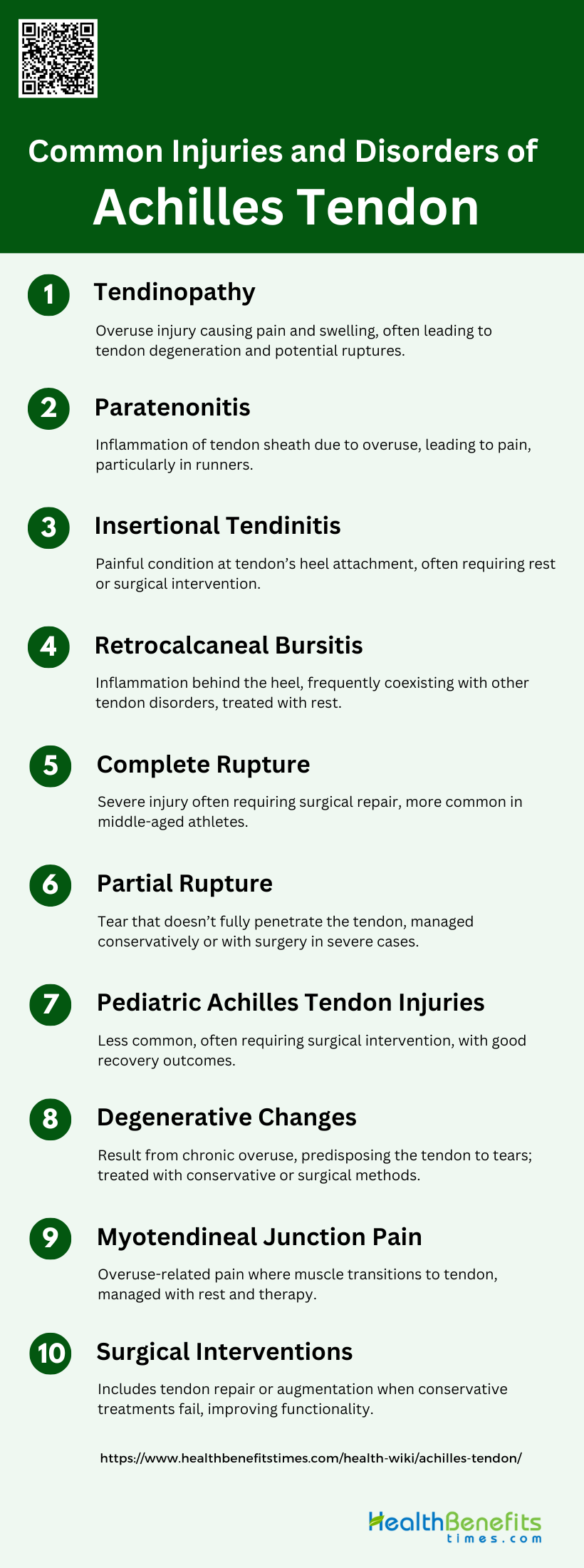The Achilles tendon is susceptible to various injuries and disorders due to its pivotal role in movement and weight-bearing activities. Understanding these common issues is essential for prevention and effective treatment. Below is a list of common injuries and disorders associated with the Achilles tendon.