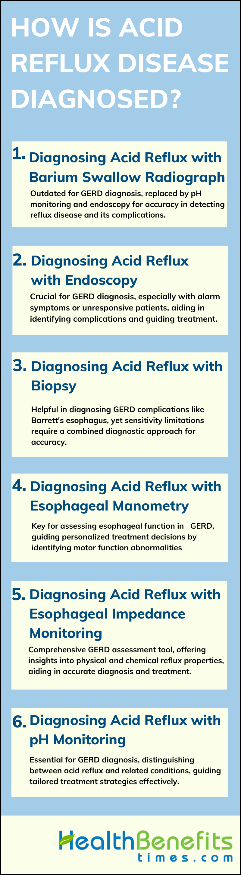 Acid reflux disease, or gastroesophageal reflux disease (GERD), is diagnosed through a combination of clinical evaluation and specialized tests. Physicians typically start with a thorough medical history and a physical examination, focusing on symptoms and dietary habits. When symptoms are not entirely indicative of GERD or when treatment does not alleviate the discomfort, more definitive diagnostic procedures may be employed. These methods not only confirm the presence of acid reflux but also assess the severity of the condition and check for potential complications. Below is a list of diagnostic methods used to identify acid reflux diseases?