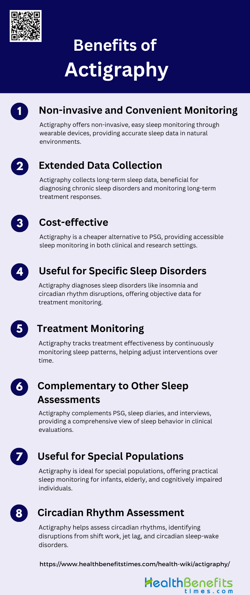 Actigraphy is a versatile and non-invasive method used to monitor sleep and activity patterns over extended periods. It provides valuable insights into sleep disorders and circadian rhythms, making it a cost-effective tool for both clinical and research applications. Below are several key benefits of using actigraphy:
