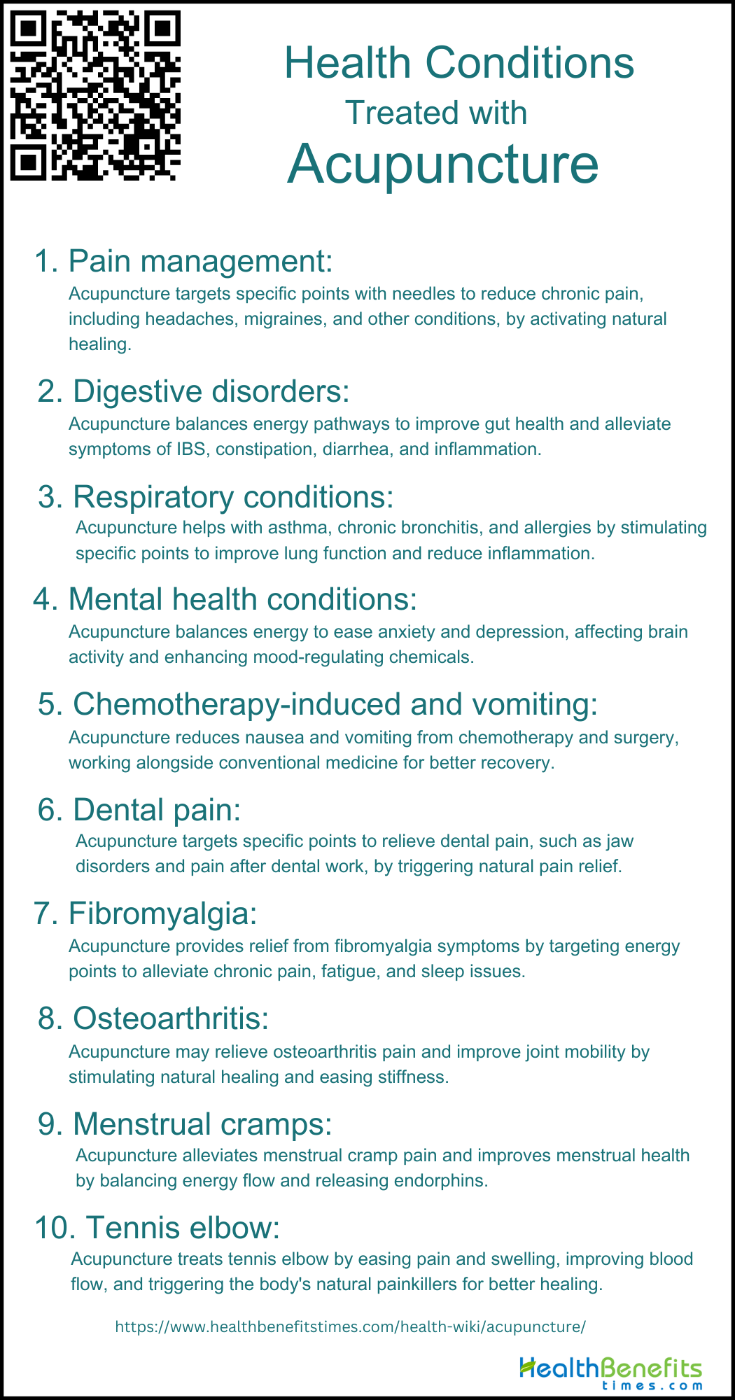 Acupuncture, a cornerstone of traditional Chinese medicine, offers a time-honored approach to holistic health, targeting a spectrum of conditions with its fine needles. Rooted in the belief of restoring the body’s energy balance, this therapeutic practice is widely recognized for its potential to alleviate various ailments. Here is a list of health conditions that acupuncture has been known to treat effectively: