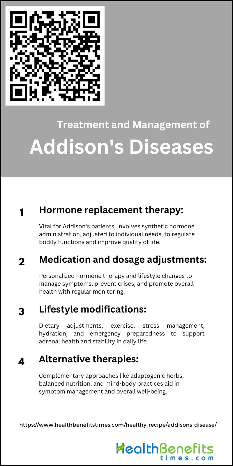 Managing Addison’s disease involves a careful balance of medication and lifestyle adjustments to maintain health. Treatment primarily includes hormone replacement therapy with medications such as hydrocortisone or prednisone for cortisol, and fludrocortisone for aldosterone, which are necessary to compensate for the adrenal glands’ inability to produce these hormones. Dosages are personalized and may need to be adjusted in response to stress, illness, or surgery to prevent an adrenal crisis. Patients must actively monitor their health and collaborate with healthcare providers to modify treatment as necessary to fit their daily life and stressors. Additionally, incorporating a holistic approach that focuses on proper nutrition, stress reduction, and regular exercise can greatly improve the quality of life for individuals with Addison’s disease. Regular appointments with an endocrinologist are essential to maintain hormone levels and manage the condition long-term.