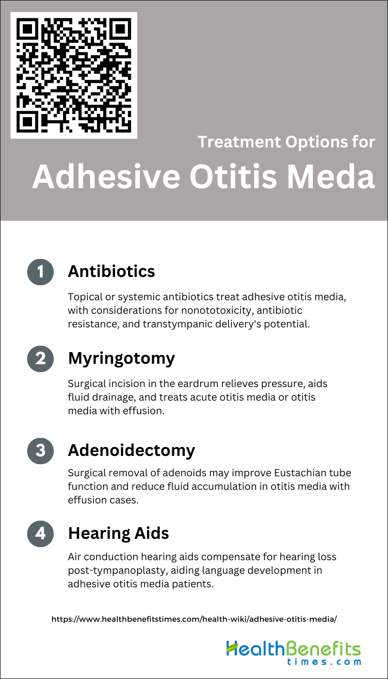 There are different treatment options for adhesive otitis media (AOM) depending on how severe and advanced the condition is. If there are repeated infections or a significant loss of hearing, surgery like tympanoplasty is often recommended. Tympanoplasty can be done along with fascia grafting catheterization, which has proven to be successful in treating AOM. This procedure can improve hearing and keep the ears dry after surgery.