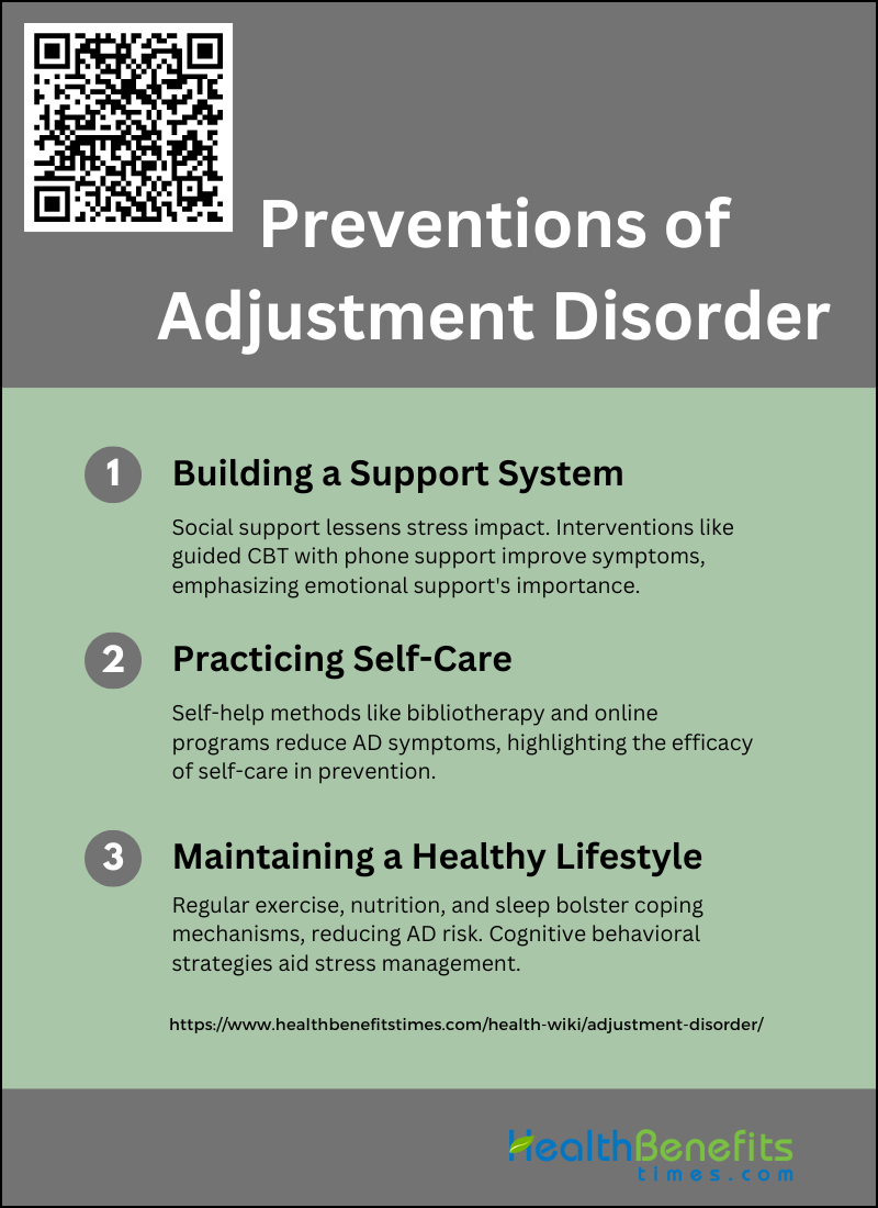 Building a robust support system is crucial in preventing adjustment disorder (AD). Social support can significantly mitigate the impact of stressors that trigger Ad. Studies have shown that interventions involving social support, such as guided internet-delivered cognitive behavioral therapy (CBT) with brief weekly telephone support, can lead to significant improvements in adjustment disorder symptoms, posttraumatic growth, and quality of life. Additionally, supportive psychotherapy has been found to be effective in managing AD, highlighting the importance of emotional and social support in treatment. Therefore, fostering a network of supportive relationships can be a key preventive measure against Ad.