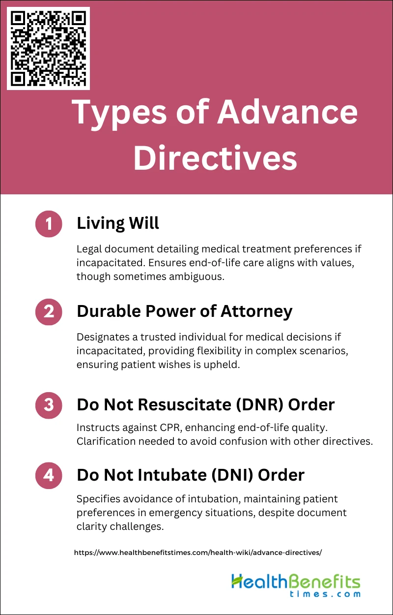 There are several types of advance directives that allow individuals to express their preferences for future medical care and decision-making. Below is a list of the various types of advance directives that one can consider when planning for future healthcare scenarios.