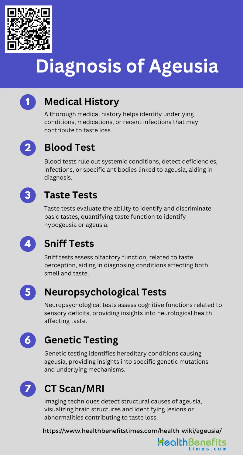 CT scans and MRIs are critical in identifying structural causes of ageusia. For example, MRI can detect thalamic plaques in multiple sclerosis patients, which are associated with ageusia. MRI has been used to investigate central nervous system involvement, although no neuroinvasive evidence was found in the late stages. These imaging techniques help visualize brain structures and identify lesions or abnormalities that may contribute to taste loss, providing essential information for accurate diagnosis and treatment planning.