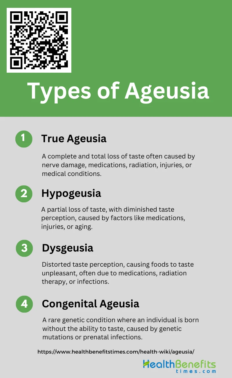 There are several types of ageusia (loss of taste) and related taste disorders: