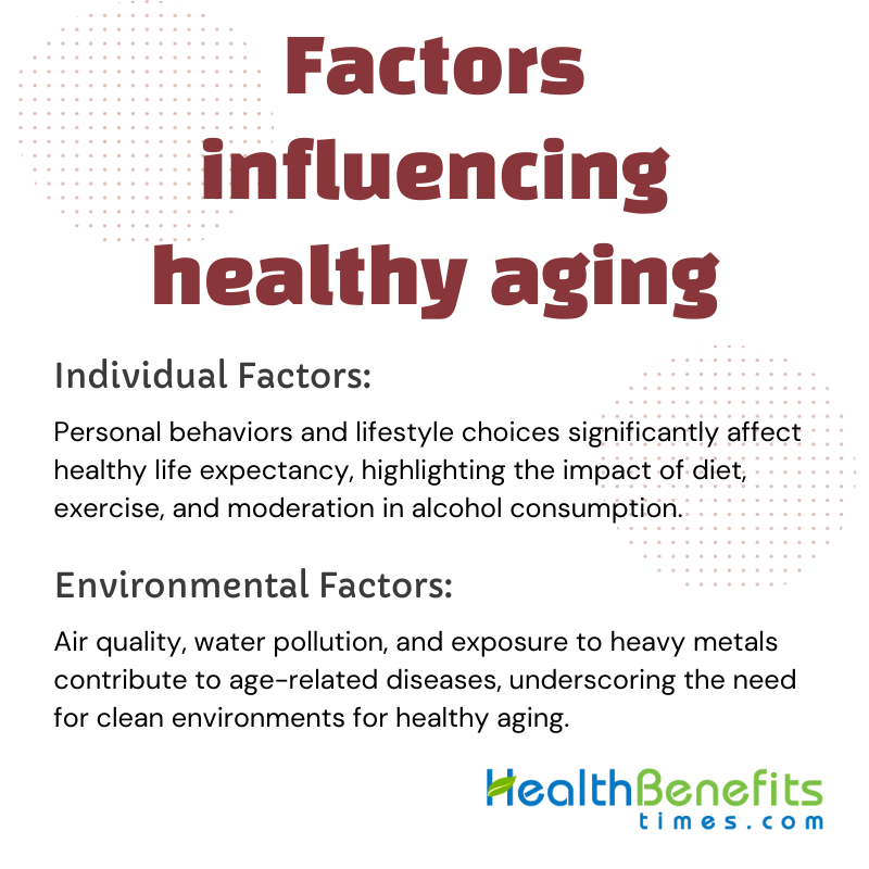 Individual factors play a significant role in influencing healthy aging. Research has shown that personal characteristics, individual behaviors, and lifestyle choices have a substantial impact on healthy life expectancy (HLE). Factors such as abnormal waist-to-hip ratio, increased coffee consumption, reduced basal metabolic rate, elevated triglycerides, and C-reactive protein levels have been identified as detrimental to healthy aging, while moderate alcohol consumption has been recognized as a positive influence. Furthermore, a healthy lifestyle index that includes weight management, smoking cessation, physical activity, alcohol moderation, and a balanced diet has been linked to a higher likelihood of healthy aging, underscoring the importance of lifestyle choices in promoting overall health during aging. By focusing on individual factors such as lifestyle choices and personal characteristics, interventions can be customized to improve outcomes in healthy aging.