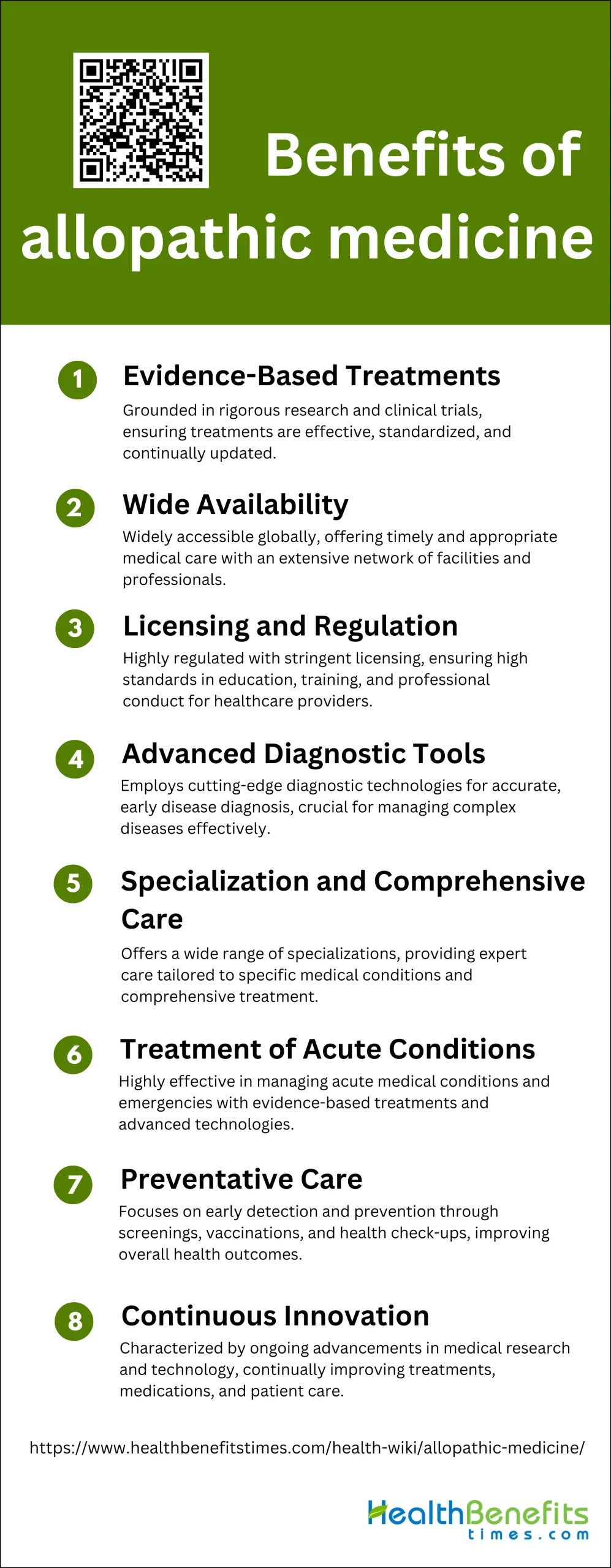 Allopathic medicine, also known as conventional or modern medicine, offers numerous benefits that contribute to its widespread use. It is based on scientific research and evidence, ensuring treatments are effective and safe. Here are some key benefits of allopathic medicine: