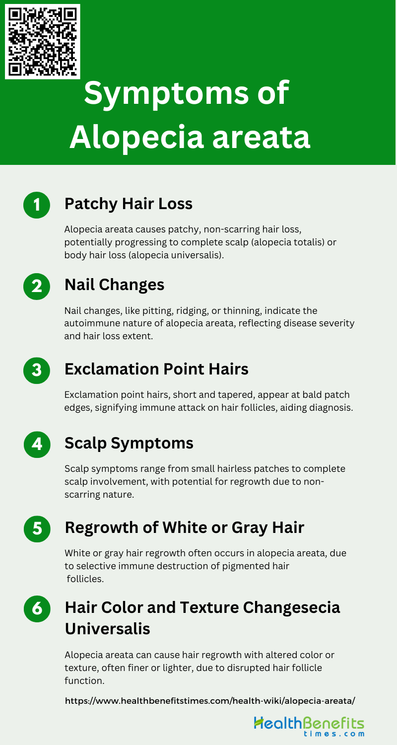 Scalp symptoms in alopecia areata can vary widely, ranging from small, well-circumscribed patches of hair loss to complete scalp involvement. The condition is non-scarring, meaning the hair follicles are preserved, which allows for the potential of hair regrowth. Inflammatory infiltrates, primarily composed of lymphocytes, are often observed around the hair follicles in affected areas. The breakdown of immune privilege in the hair follicle is believed to be a critical factor in the pathogenesis of AA, leading to localized inflammation and hair loss.