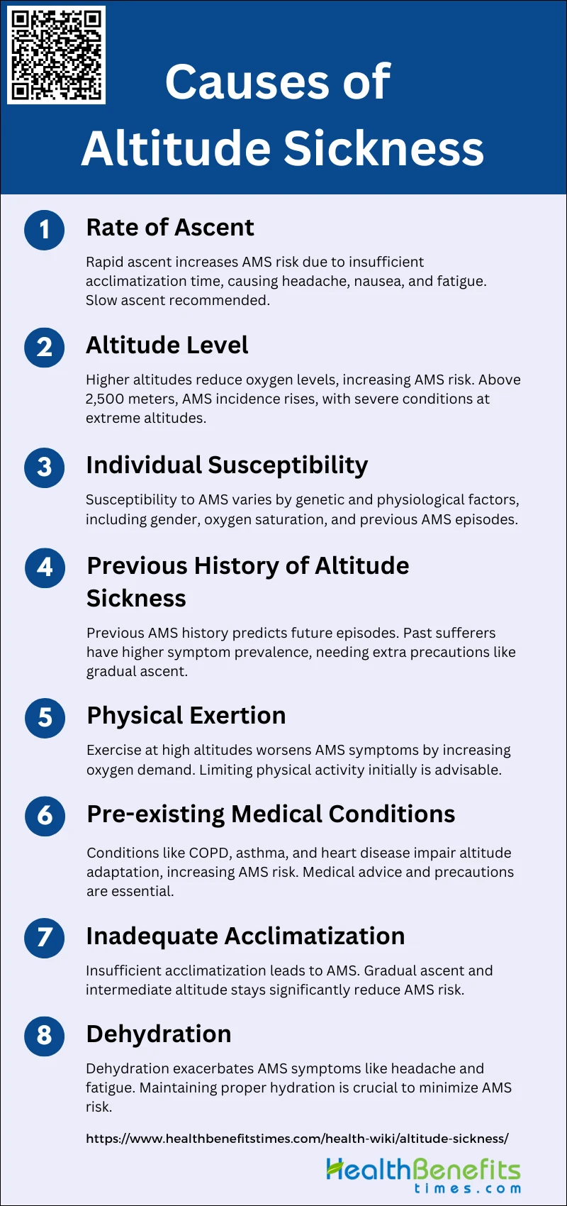 This condition can affect anyone, regardless of age or fitness level, and is typically experienced at altitudes above 8,000 feet (2,400 meters). The primary causes of altitude sickness include: