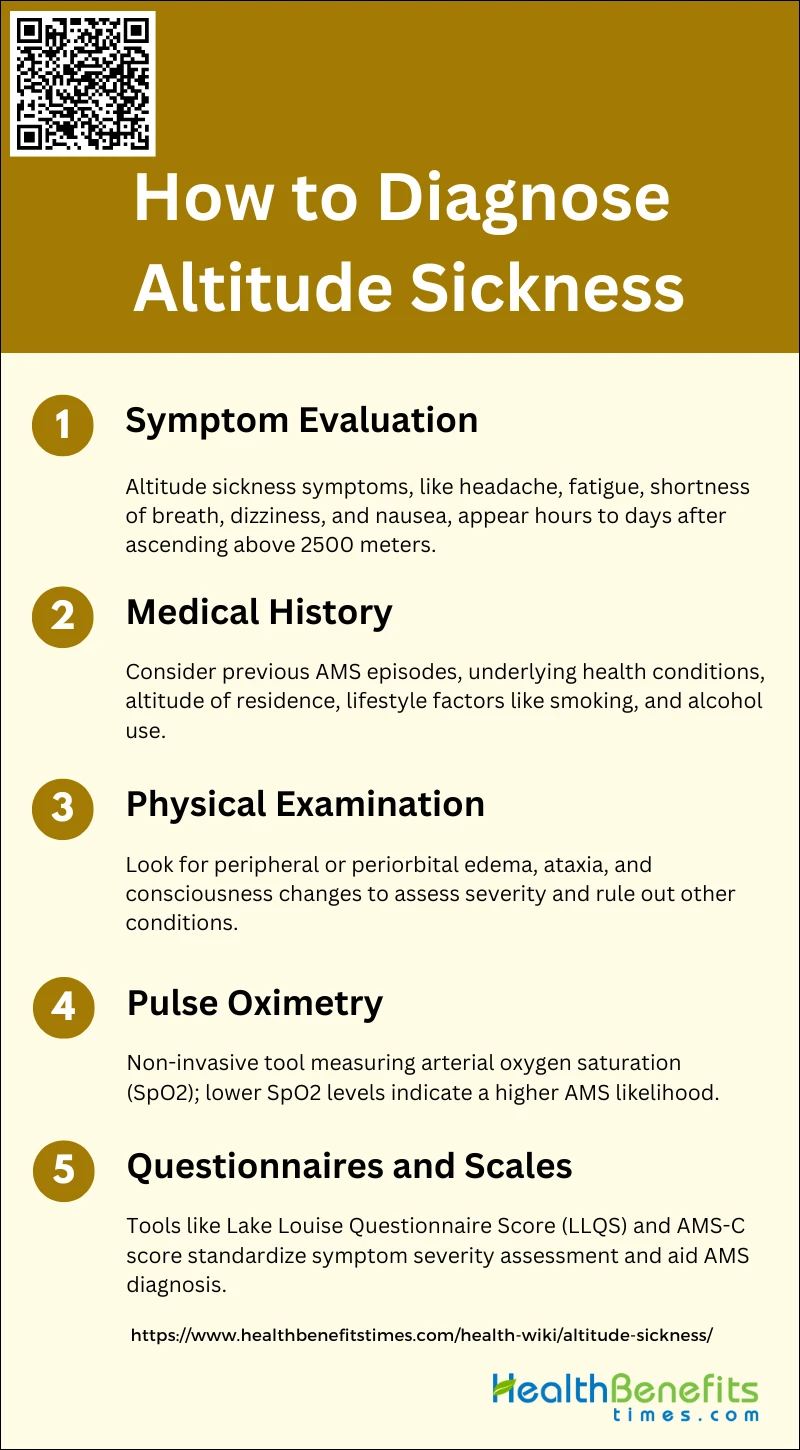 Diagnosing altitude sickness involves recognizing the symptoms and understanding the context of recent altitude exposure. Common symptoms include headache, nausea, dizziness, and fatigue, which typically appear within hours of ascending to high altitudes. To confirm a diagnosis, consider the following steps: