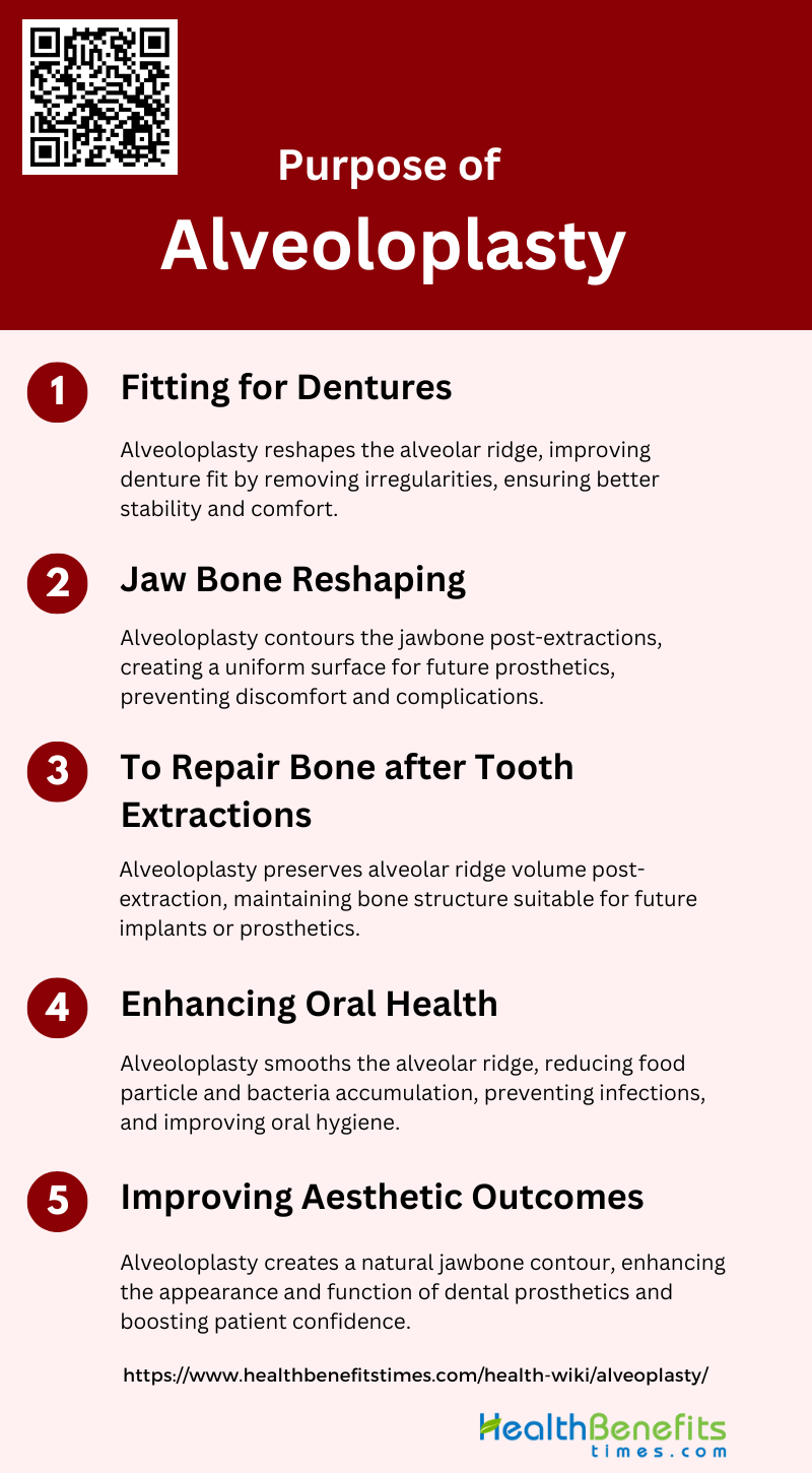 Alveoloplasty is a surgical procedure designed to reshape and smooth the jawbone, typically performed after tooth extraction or in preparation for dentures. This procedure aims to enhance the fit and comfort of dental prosthetics, facilitate healing, and improve overall oral function. The primary purposes of alveoloplasty include: