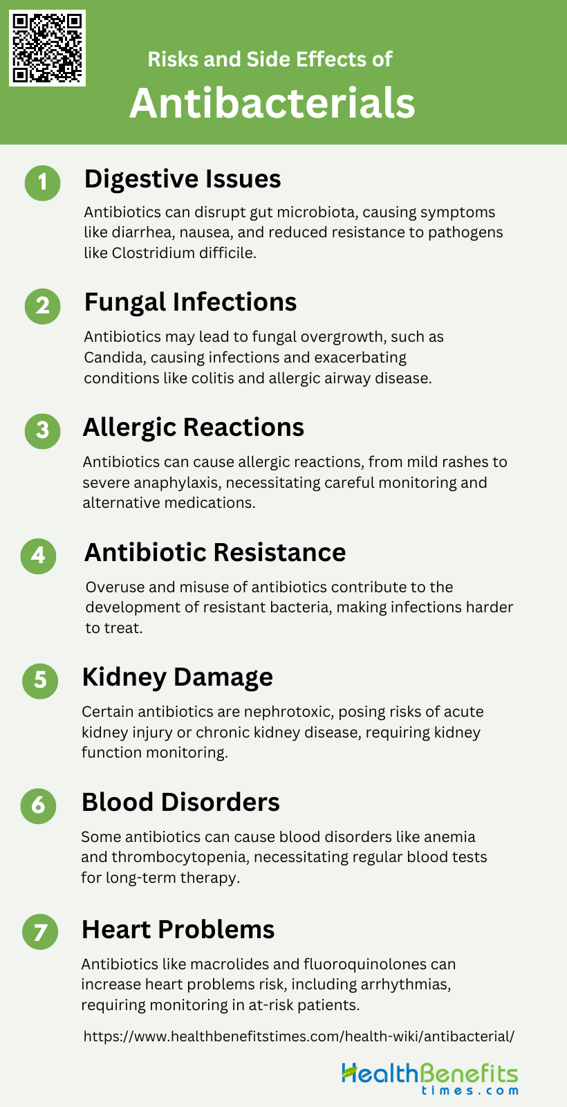 While antibacterials are crucial for combating infections, they also come with potential risks and side effects. Misuse or overuse can lead to antibiotic resistance and adverse health effects. Below are some common risks and side effects associated with antibacterials: