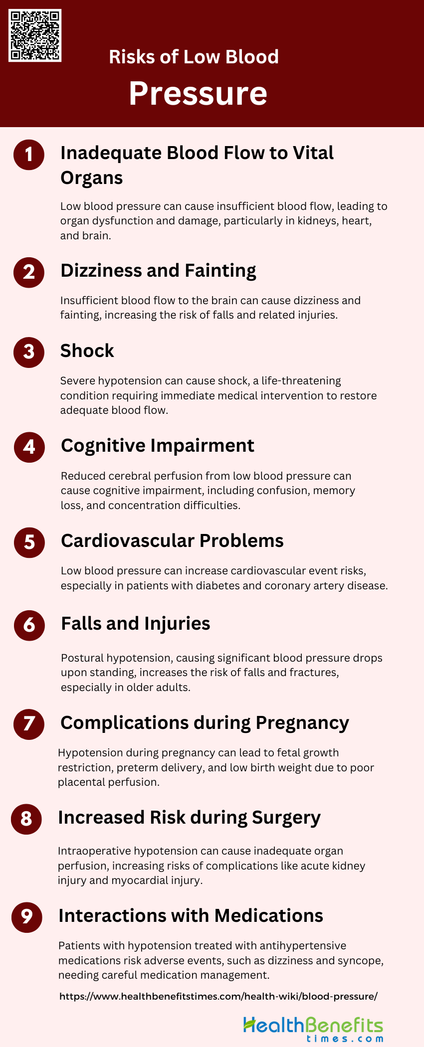 Low blood pressure, or hypotension, can lead to various health issues that may affect daily functioning and overall well-being. Recognizing these risks is essential for managing and mitigating potential complications. Below are some of the primary risks associated with low blood pressure: