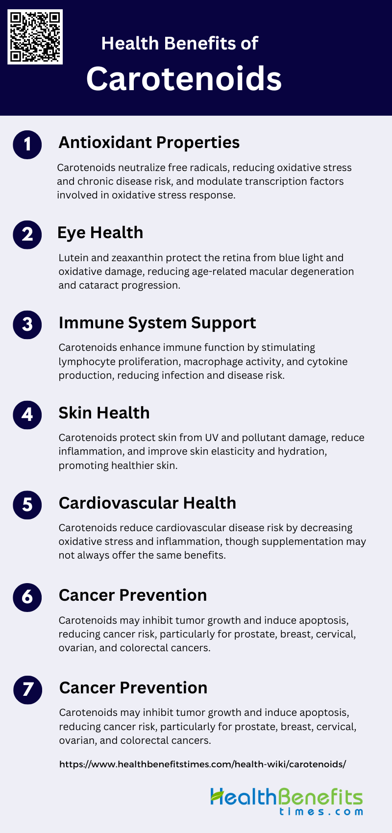 Carotenoid plays a significant role in supporting the immune system. They can modulate immune responses by affecting cell growth and gene expression. Carotenoids stimulate the proliferation of B- and T-lymphocytes, enhance the activity of macrophages and cytotoxic T-cells, and increase the production of cytokines. These immune-boosting properties help in maintaining overall health and reducing the risk of infections and diseases related to low immune function. The intake of carotenoid-rich foods is thus beneficial for enhancing immune system performance.