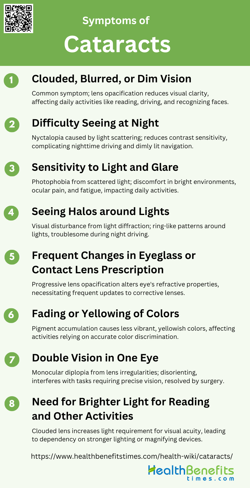 Cataracts can significantly affect vision, leading to various symptoms that may worsen over time. Recognizing these symptoms early can help in seeking timely treatment. Below are some common symptoms of cataracts: