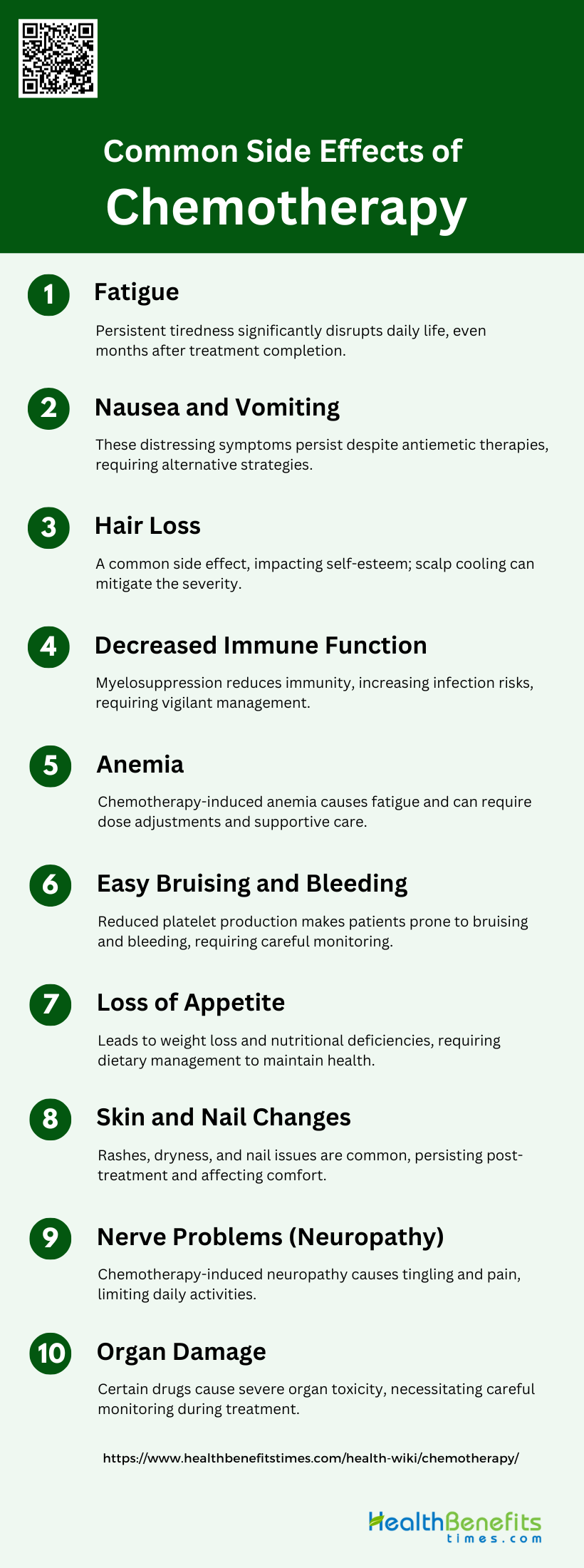 Chemotherapy can cause damage to vital organs, including the heart, lungs, and kidneys. For example, cisplatin is known for its nephrotoxicity, while other drugs can cause cardiotoxicity and pulmonary toxicity. These side effects can be severe and may limit the use of certain chemotherapy agents. Patients undergoing treatment require extensive monitoring of their organ functions to detect and manage any damage early. Effective management strategies and supportive care are essential to mitigate the risks of organ damage during chemotherapy.
