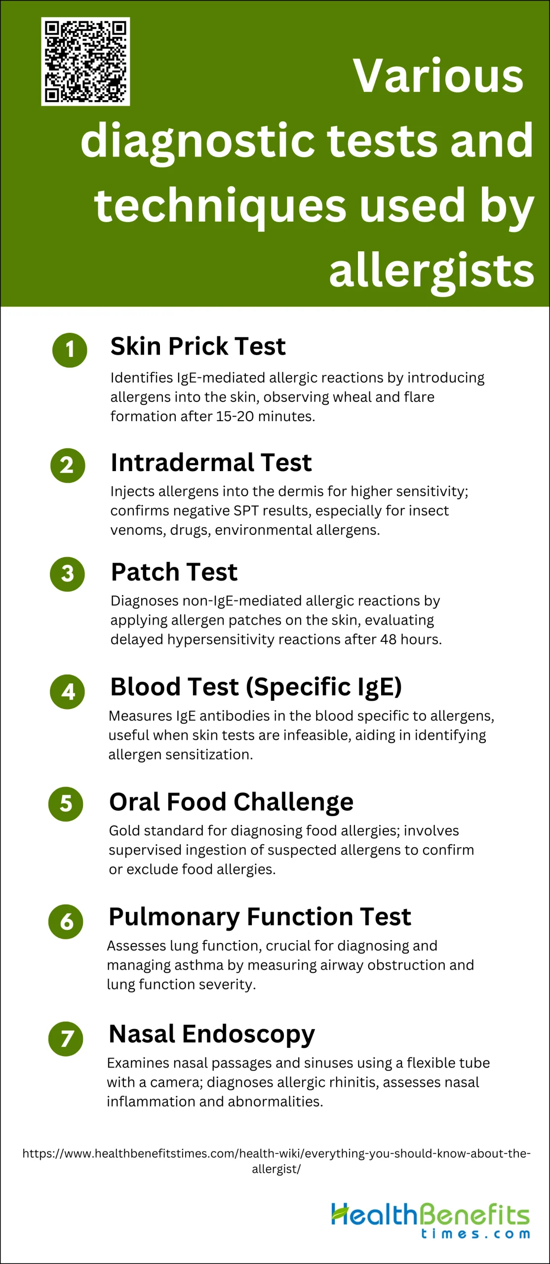 Allergists employ a variety of diagnostic tests and techniques to identify and manage allergic conditions effectively. These methods range from simple skin tests to more complex blood tests and imaging techniques. Below is a list of common diagnostic tests and techniques used by allergists: