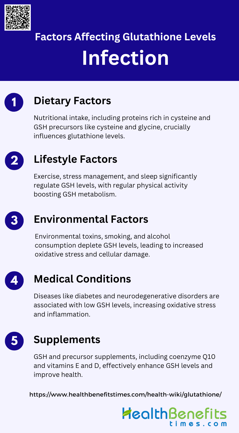 Various medical conditions can affect GSH levels. Diseases such as diabetes, cardiovascular diseases, and neurodegenerative disorders are associated with low plasma GSH levels, which contribute to increased oxidative stress and inflammation. Additionally, aging is linked to a decline in GSH synthesis, leading to higher oxidative stress and damage. Supplementation with GSH precursors and other dietary supplements can help improve GSH levels and mitigate the adverse effects of these medical conditions.