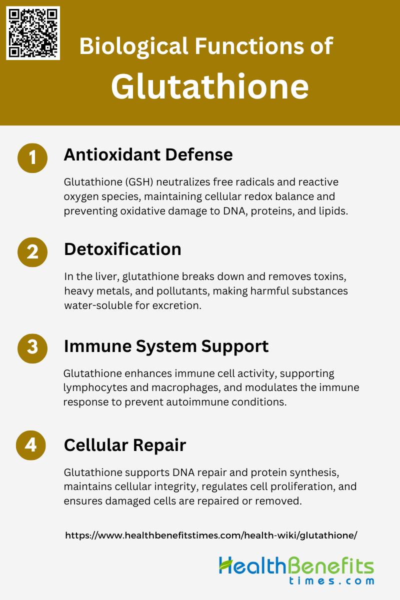 Glutathione is a crucial antioxidant that plays multiple roles in maintaining cellular health and function. It is involved in detoxification, immune system support, and protection against oxidative stress. Below is a list of the key biological functions of glutathione: